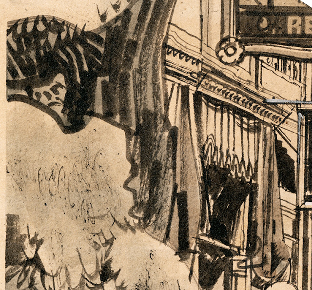Up close, the drawing reveals an extraordinary array of marks on paper, from drybrush swirls to bold, virile stripes.  Who could squeeze more character into brushwork than Fawcett?